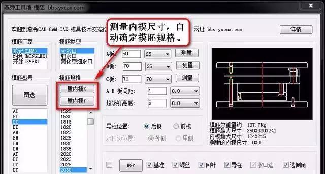 這個方法最大的好處就是不需要自己去計算,這個軟件掛幫助我們計算了,第二個方法就是根據(jù)模仁長寬與標準模架長寬的對應(yīng)關(guān)系來確定模胚大小。就寬度來講,模架所能容納的模仁寬度近似于頂針板的寬度,最好就是模仁寬度比頂針板的寬度要小5-10mm。或者模架寬度=模仁寬度/(0.6-0.7)